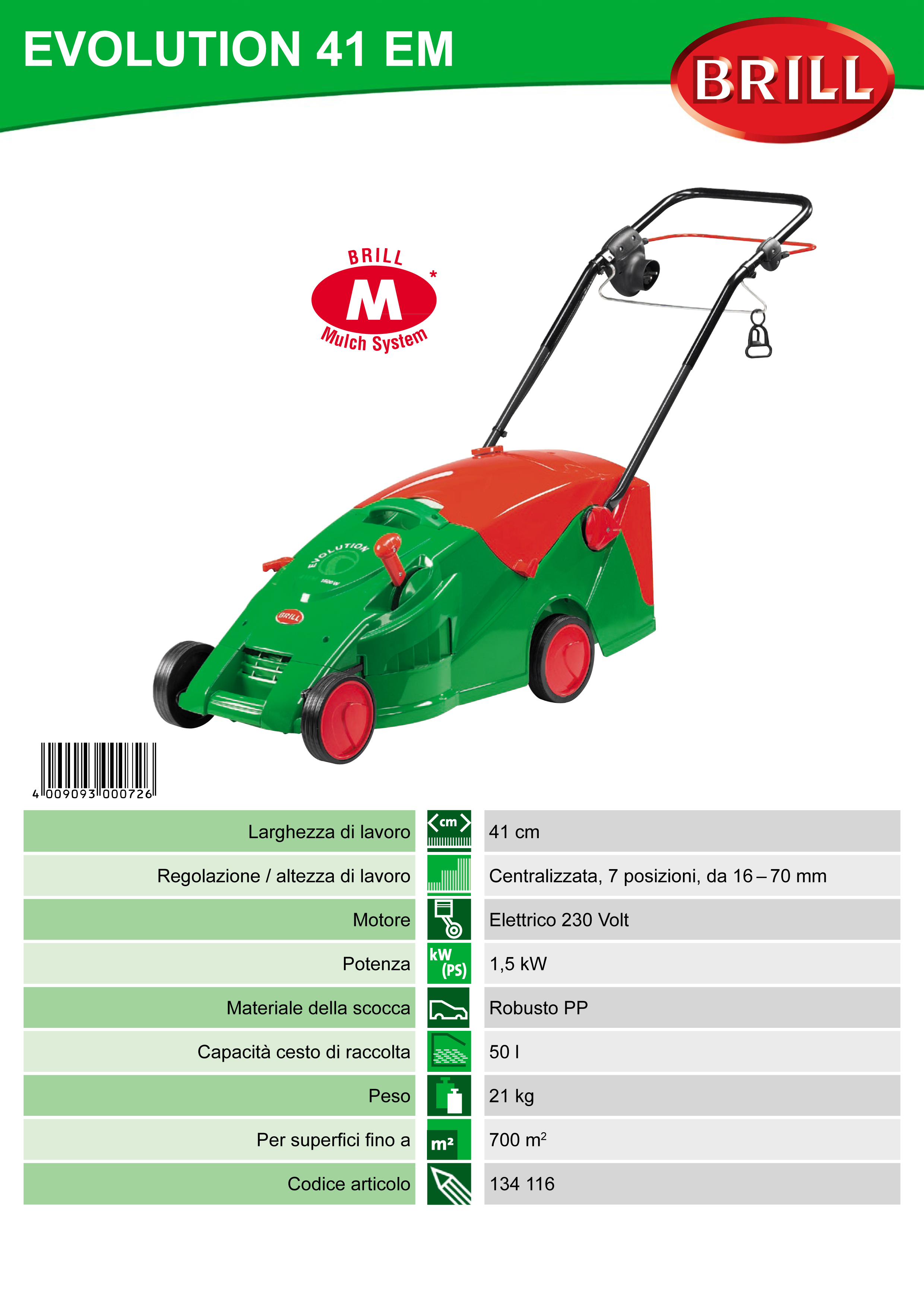 Tagliaerba Elettrico BRILL mod. EVOLUTION 41 EM - 1500 Watt