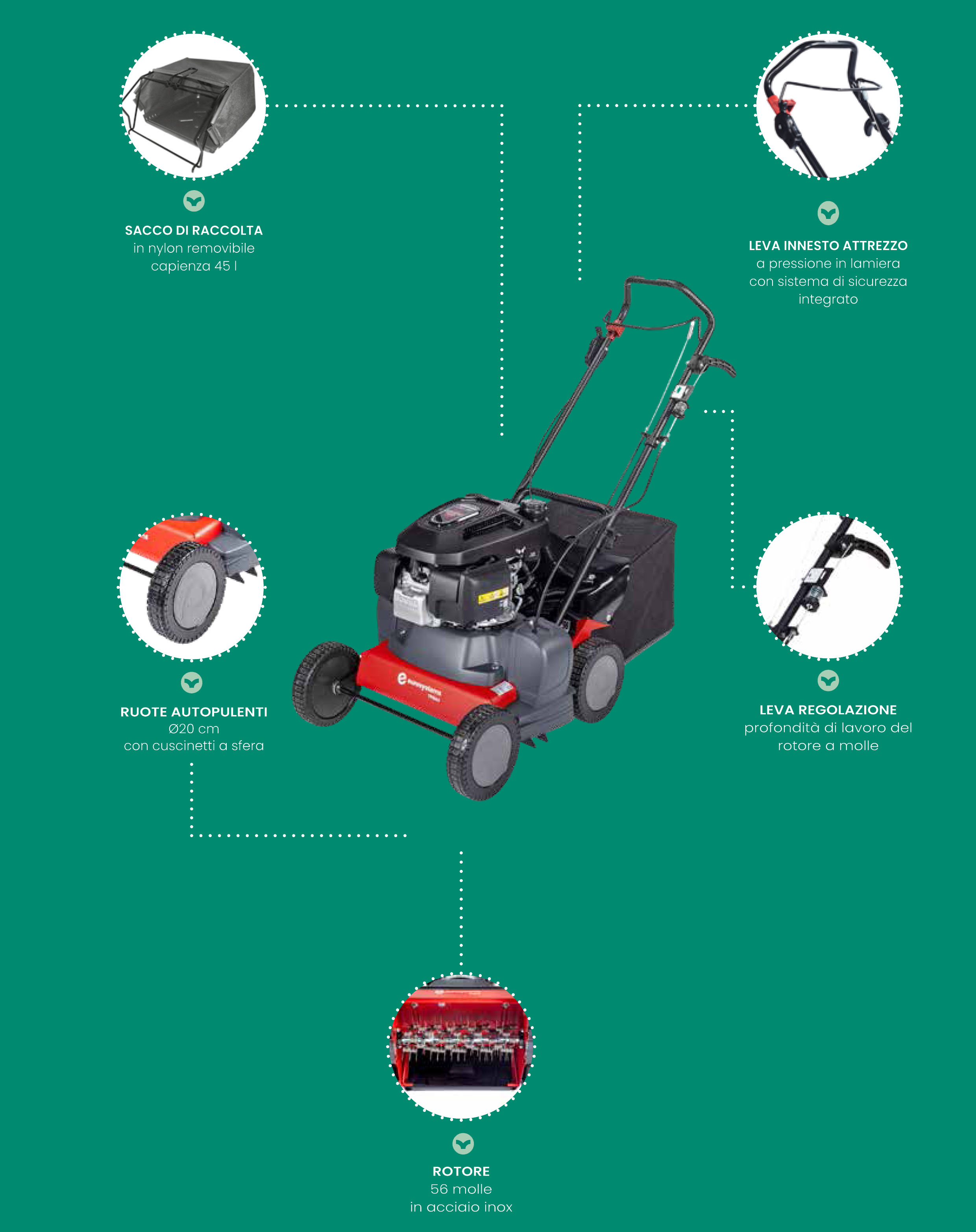 Tpm42 è un arieggiatore a molle sviluppato per la pulizia e la manutenzione dei campi sintetici domestici senza riempimento granulare: il particolare rotore formato da 56 molle in acciaio INOX è studiato per rimuovere muschio ed erbe infestanti che possono nascere e mischiarsi alla tessitura del prato sintetico. Il sacco di raccolta da 45 litri è ideale per raccogliere lo sporco e i residui vegetali.