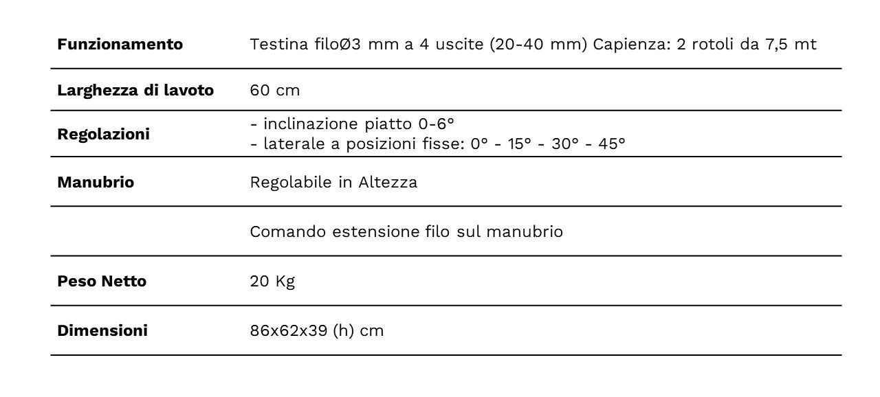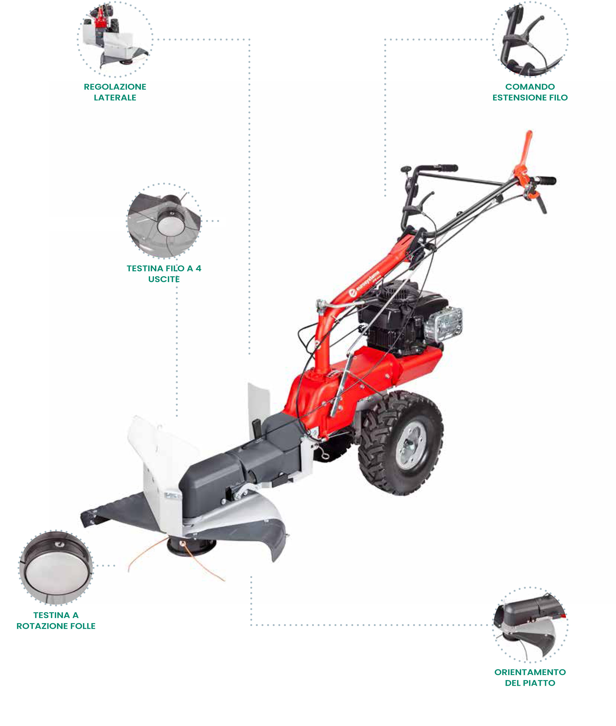 La multi attrezzo P70 EVO in questa versione è dotata di decespugliatore (testina con 4 uscite). In questa configurazione l’accessorio viene montato frontalmente. La macchina è dotata di 3 velocità di lavoro e 2 velocità di retromarcia. La larghezza di lavoro del decespugliatore è pari a 60 cm (la testina è dotata di 2 rotoli da 7,5 mt di filo Ø3 mm) Le regolazioni del piatto di taglio permettono l’inclinazione laterale in 4 posizioni e puo’ esser ruotato di 6 gradi, per la perfetta pulizia di ogni spigolo o angolo difficile da raggiungere.