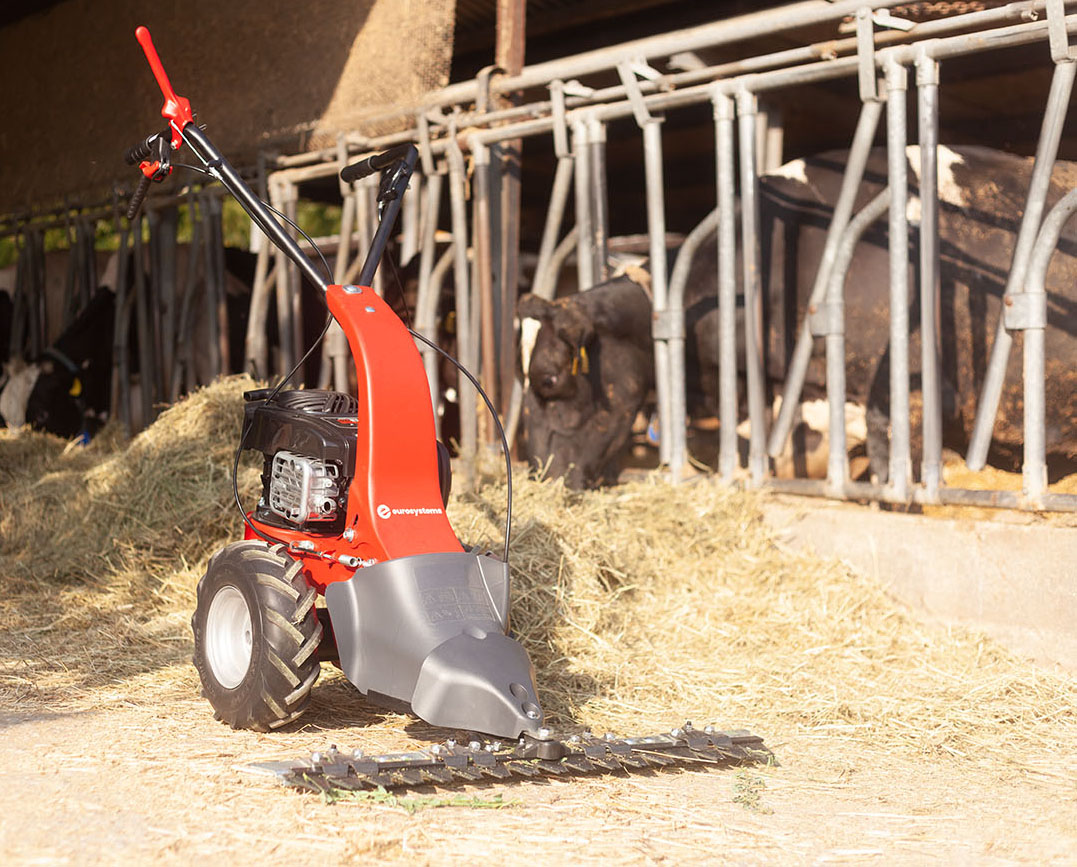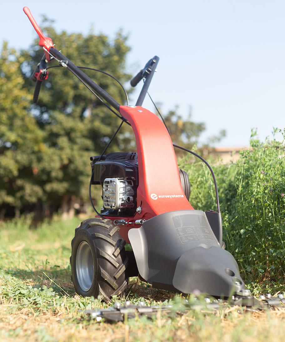 La motofalciatrice M90 di Eurosystems è un prodotto compatto e di facile utilizzo. Progettata per superfici fino a 5.000 mq e costruita per essere utilizzata in piena sicurezza e senza eccessivi sforzi. La larghezza di lavoro di questa motofalciatrice è pari a 87 cm e la barra di taglio è dotata di movimento monolama (la lama inferiore è fissa mentre quella superiore è oscillante). I comandi si trovano tutti sul manico di guida in modo da non dover togliere mai le mani durante il lavoro ed il manubrio è registrabile verticalmente per avere una corretta posizione di lavoro. Il cofano spargierba è oscillante, per liberarsi dall’erba appena tagliata ed è un brevetto Eurosystems