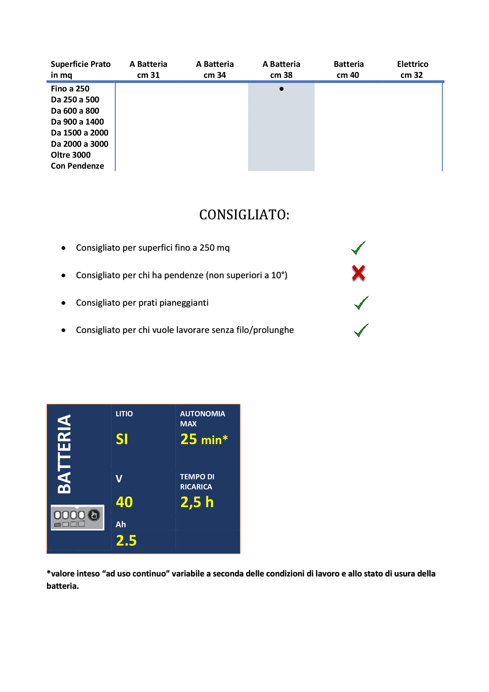 • Motore a batteria al litio: batteria da 40 V – 2,5Ah