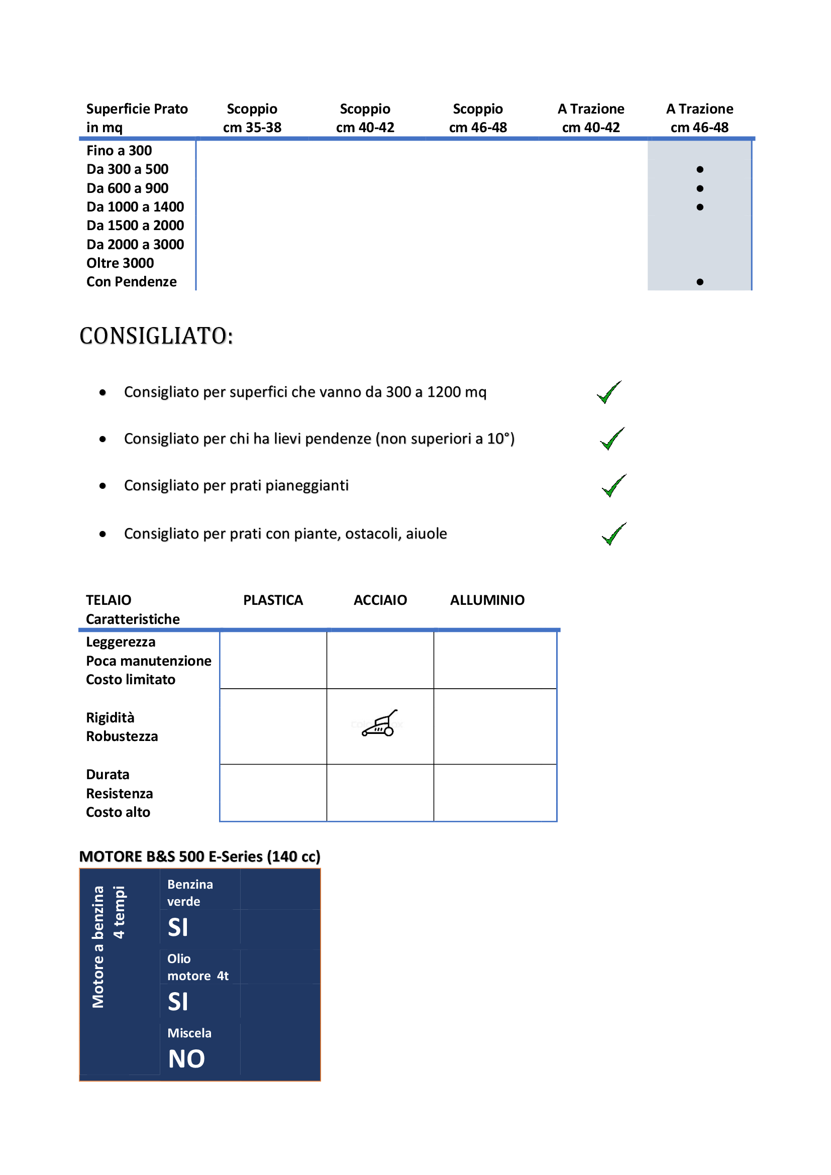 Questo modello monta motore a benzina 4 tempi Briggs & Stratton (azienda americana, una dei maggiori costruttori al mondo di motori per macchine da giardino) da 140 cc – mod. 500 E-Series