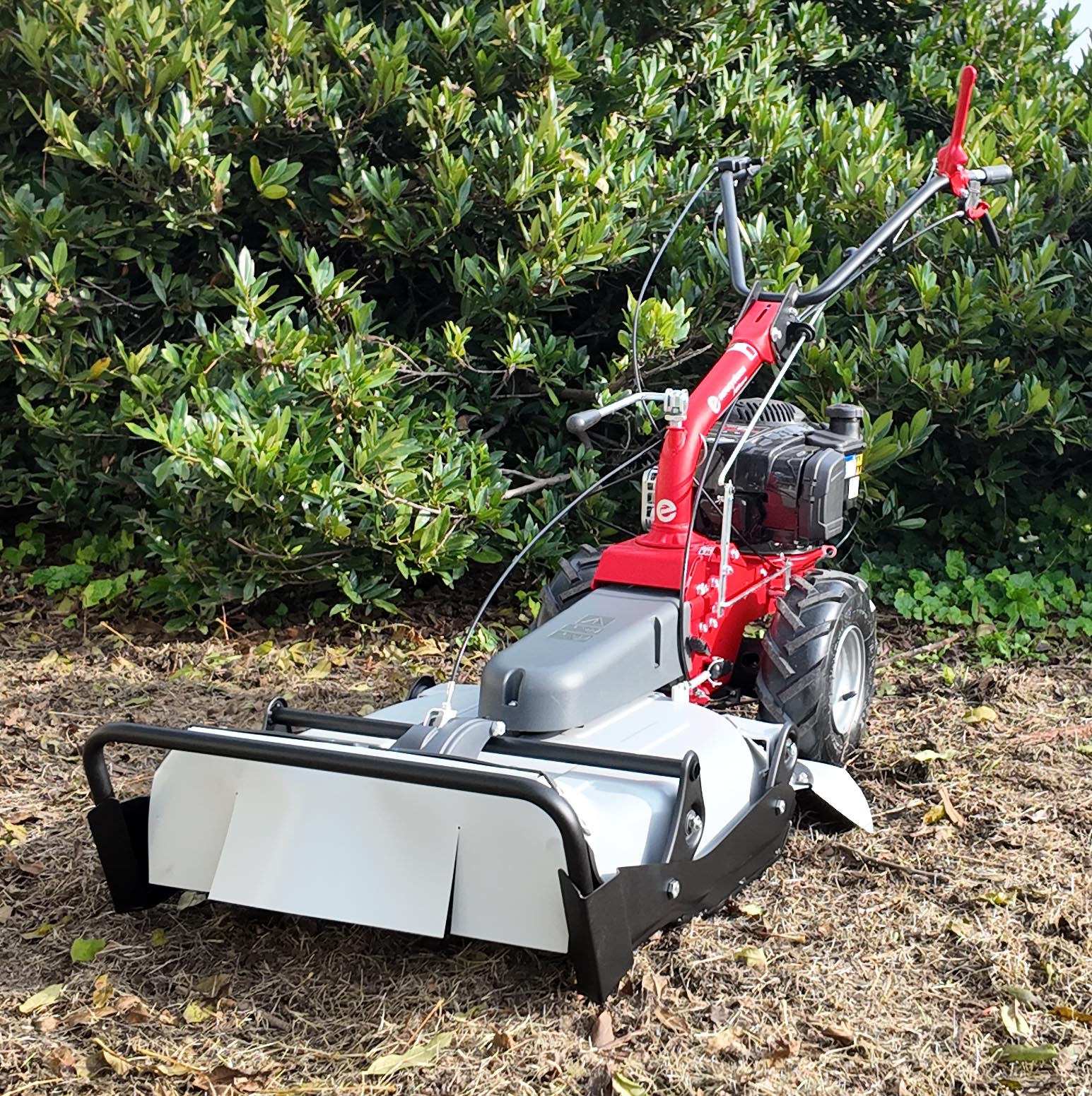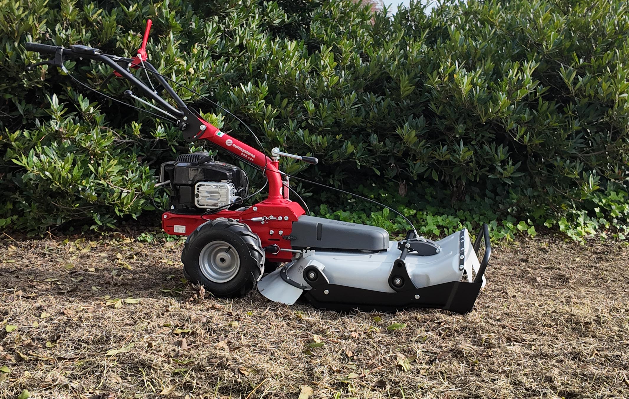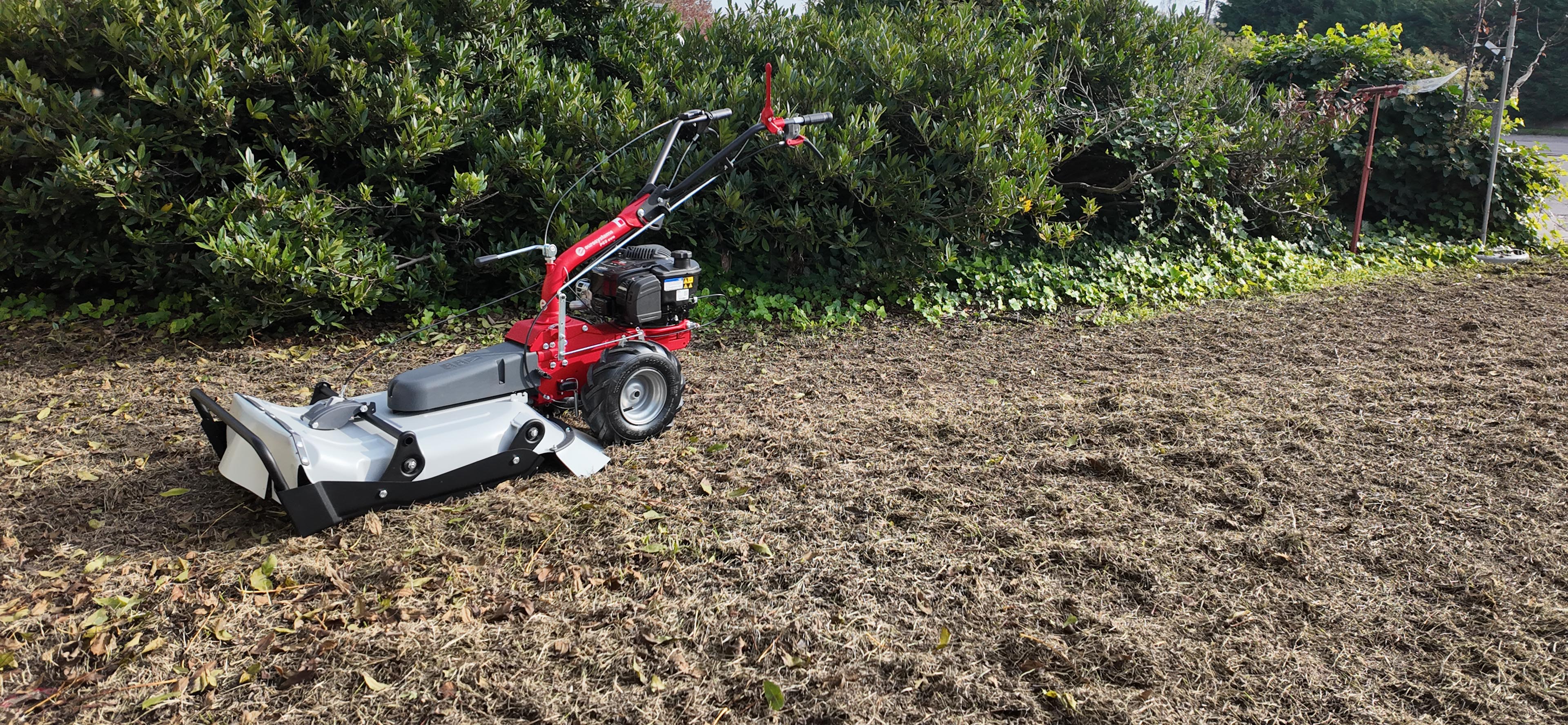 La multi attrezzo P55 EVO in questa versione è dotata di falciatutto PRO (rotore singolo a 4 coltelli pivotanti) per essere un robusto e pratico falciatutto trinciaerba. In questa configurazione l’accessorio viene montato frontalmente. La macchina è dotata di 1 velocità di lavoro e 1 retromarcia. La larghezza di lavoro del falciatutto è pari a 53 cm e l’altezza di lavoro è registrabile in 3 posizioni: 5 cm, 8 cm oppure 10,5 cm. In questo modello, la regolazione dell’altezza di taglio dell’erba è possibile direttamente tramite i comandi al manubrio.